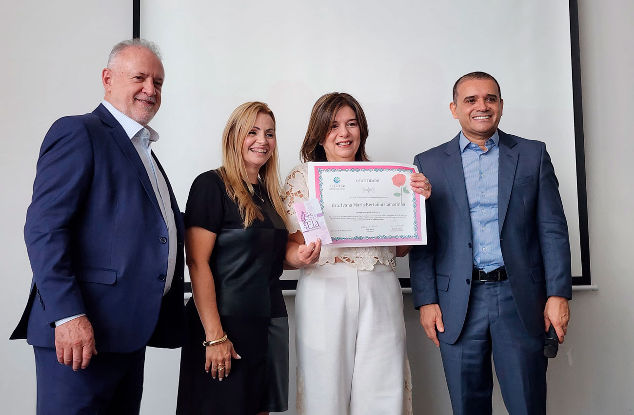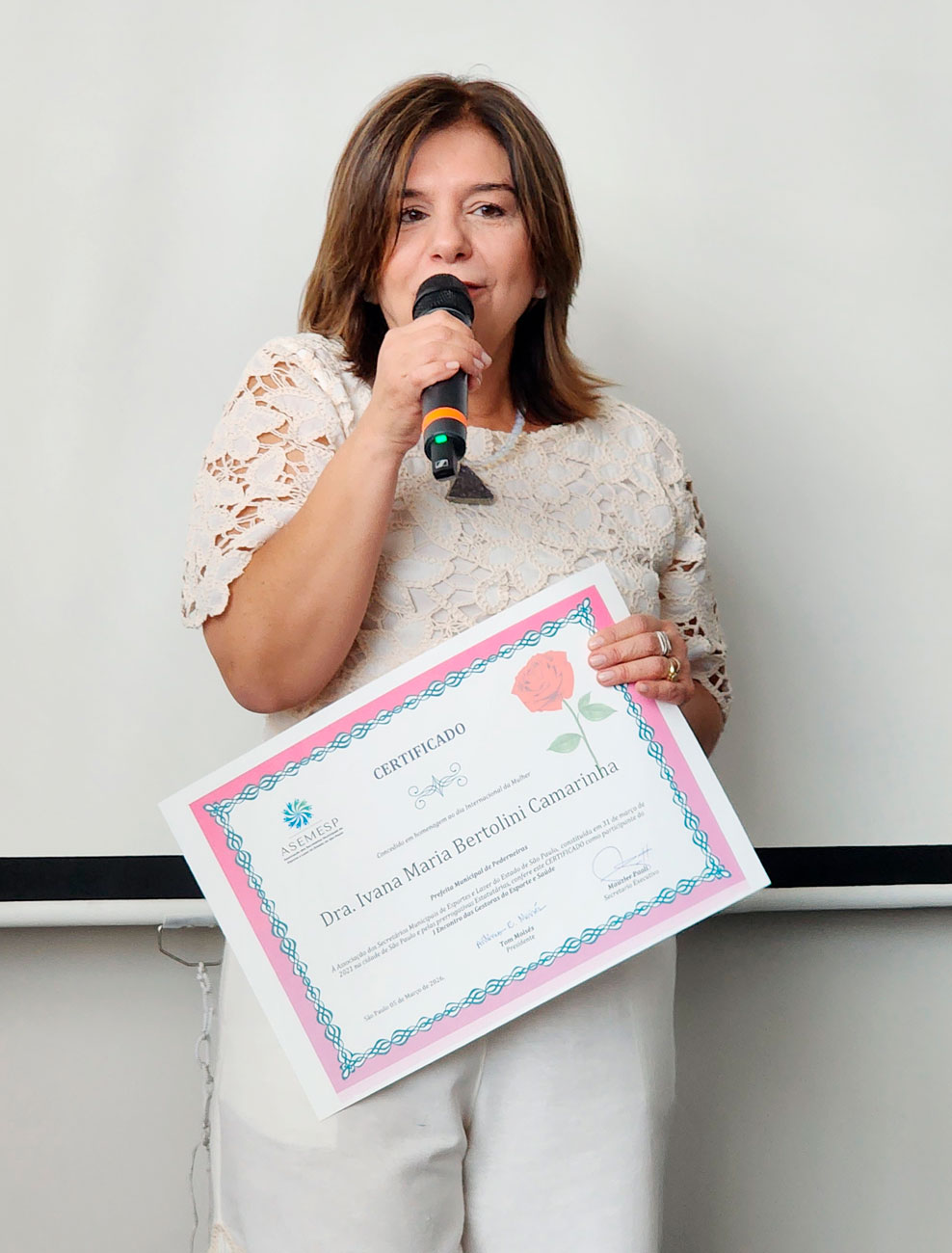 Ivana Maria Bertolini Camarinha recebe certificado de reconhecimento durante homenagem às mulheres que se destacam na administração pública e no desenvolvimento social © Global Sports